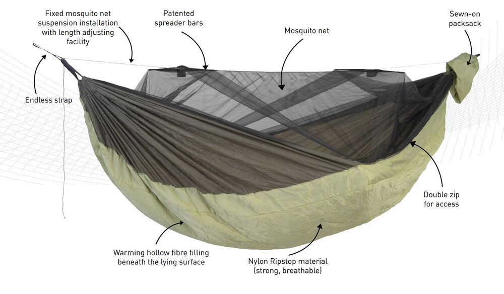 A Moskito-Traveller Quilted XXL nemcsak a talaj hidegétől véd meg, hanem a repülő rovaroktól is, mint a szúnyogok és a szúnyogok, valamint a mászó rovaroktól, mint a kullancsok, hangyák és csótányok. A bejárat az egyik oldalon dupla cipzárral történik. A szúnyogháló a mellékelt pálcákkal szétfeszíthető, így egy nagyobb tér lesz a függőágyban. Az integrált gerinczsinór tartja a szúnyoghálót feletted.