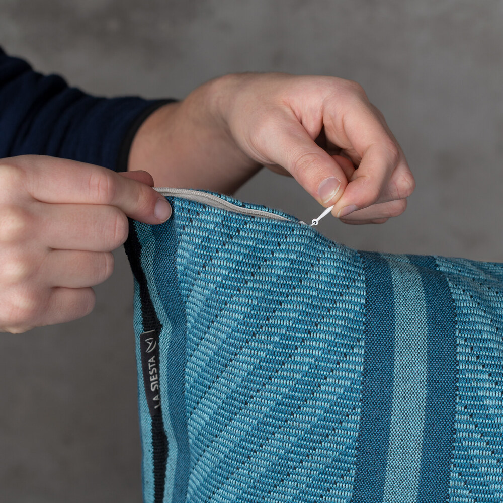 A LA SIESTA Flora Blue Zebra biopamut függőágyhoz és a LA SIESTA Habana Blue Zebra függőfotelhez rendelhető, azonos textilből készült párna.