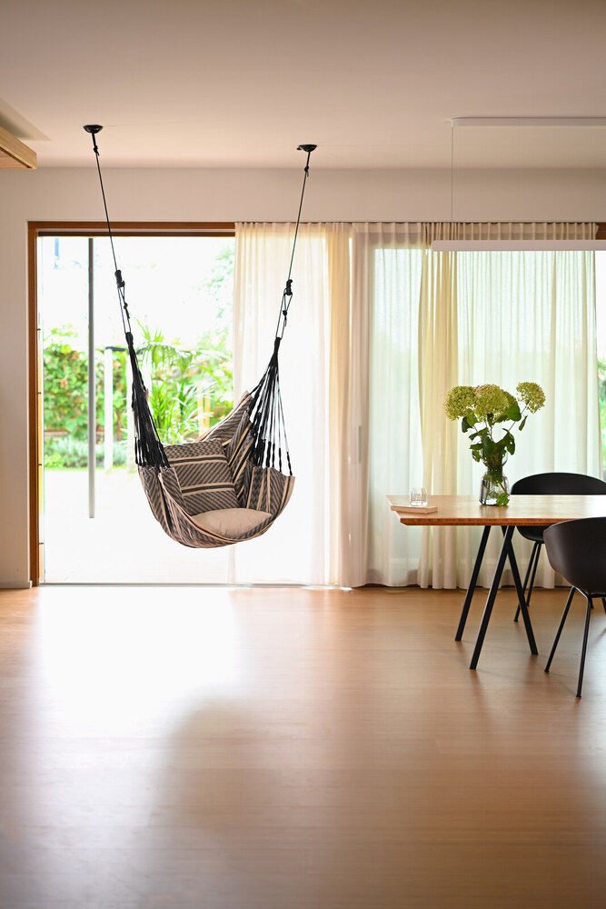- Felakaszthatod a plafonra (vagy fák közé, bárhová) két pontos rögzítéssel, lásd a galériát.