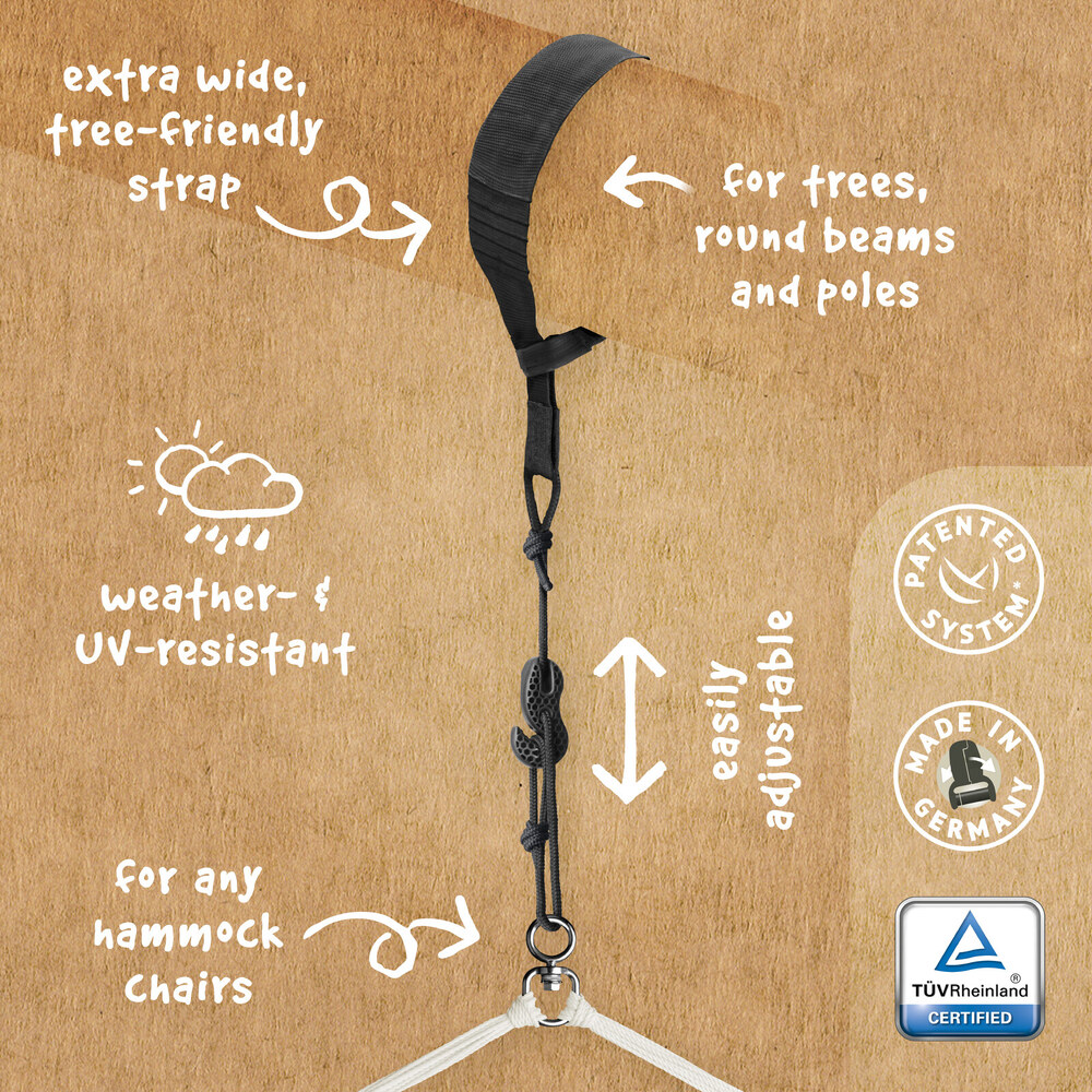 A konstrukció nagyon praktikus, az anyag ellenáll az UV-sugaraknak és időjárásálló. A felfüggesztés ezen módja nem csupán leegyszerűsíti a kötél hosszának beállítását, de lehetővé teszi a függőszék gyors felszerelését és eltávolítását.