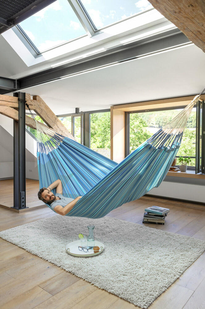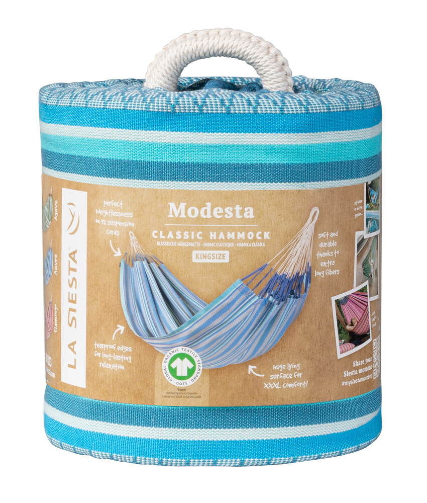 A Modesta függőágy szálai 100% tiszta biopamutból készülnek, amit a hitelesített szerves művelés tesz lehetővé. Lélegzetelállítóan gyönyörű természetes színek, melyek tökéletesen illeszkednek életének hangulatához. Hatalmas méret az extra kényelemért.