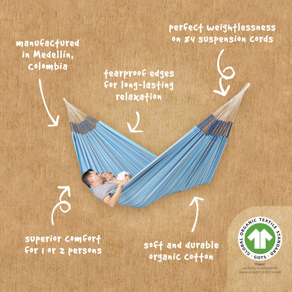 A Modesta függőágy szálai 100% tiszta biopamutból készülnek, amit a hitelesített szerves művelés tesz lehetővé. Lélegzetelállítóan gyönyörű természetes színek, melyek tökéletesen illeszkednek életének hangulatához. Hatalmas méret az extra kényelemért.
