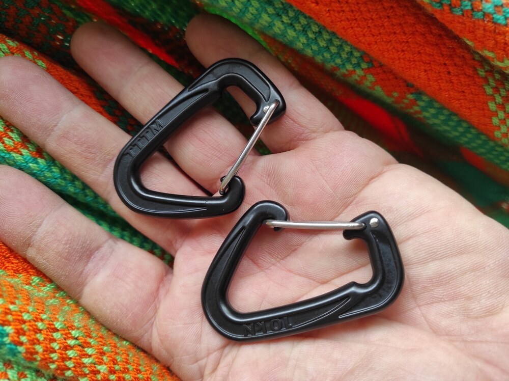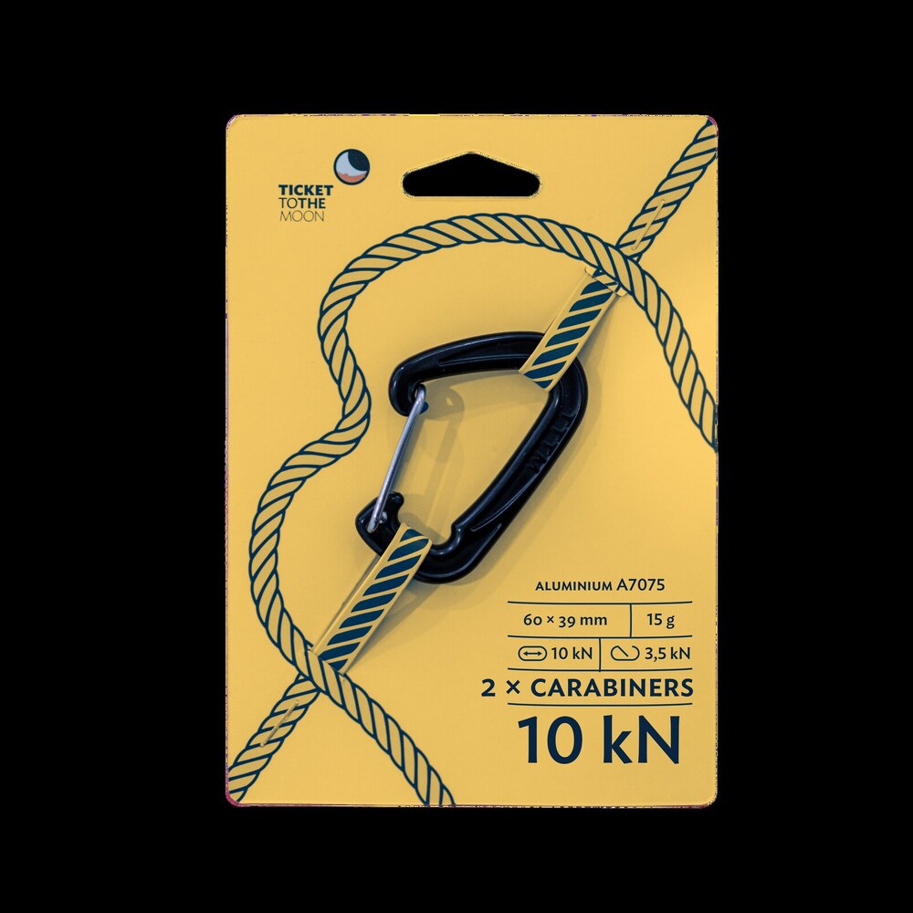A Ticket To The Moon függőágyak végén egy roppant erős S kampó található alapestben, amivel könnyedén felakasztható a hozzá tartozó kötélre. Vannak, akik mégis jobban szeretik a karabinerrel szerelést, nekik gyárt a Ticket To The Moon pille könnyű de nagy teherbírású karabinereket. Úgy tervezték, hogy a kötelek elhelyezkedése optimális legyen, és a karabiner soha ne tegyen kárt sem a kötélben, sem a függőágy anyagában.