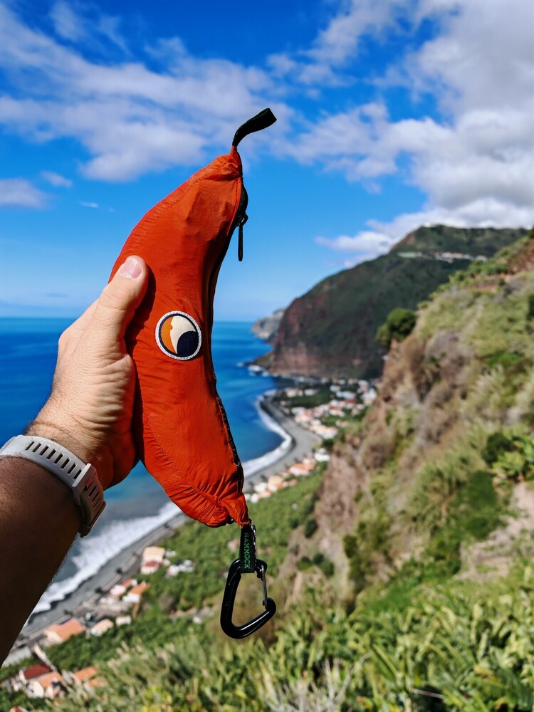 A függőágy mindkét végén 10KN teherbírású ultralight karabinerek vannak, ez a csomag része.