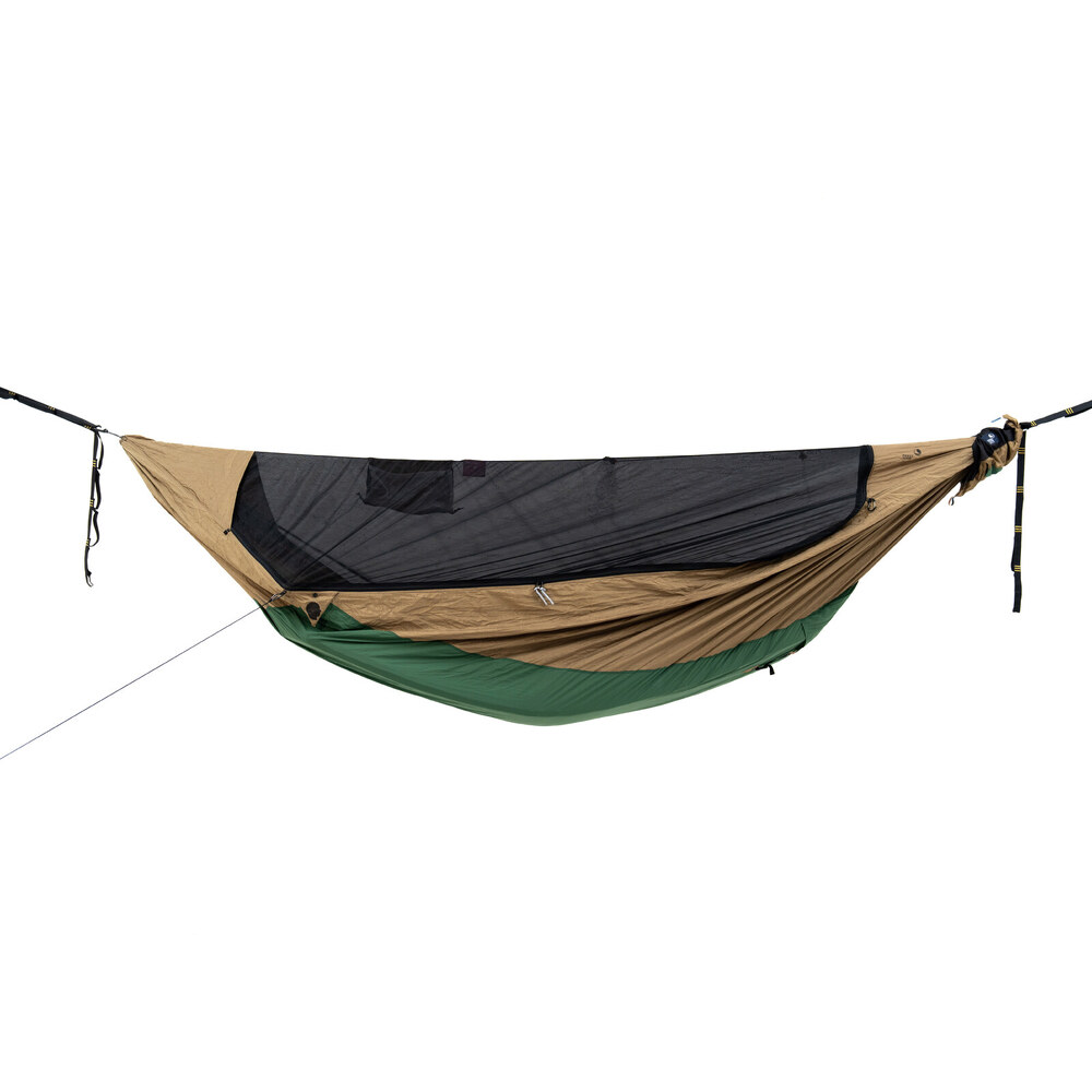Ez az 1,7 m széles túrafüggőágy egy alsó zsebbel rendelkezik, amely minden szabványos matrachoz illeszkedik (70x200cm). Annak érdekében, hogy a lehető legkényelmesebben érezd magad, egy gerinczsinórt (ridgeline) is beépítettünk ebbe a függőágyba Ezzel az új útitárssal még akkor is pihenhetsz a földön, ha a függőágy felakasztása nem lehetséges.